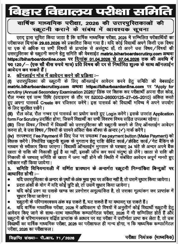 The Bihar School Examination Board (BSEB), Patna has released the official notification for the Class 10th (Matric) and Class 12th (Intermediate) Scrutiny Online Form 2026. Candidates who are not satisfied with their board exam results can apply online for answer sheet rechecking through the official website.